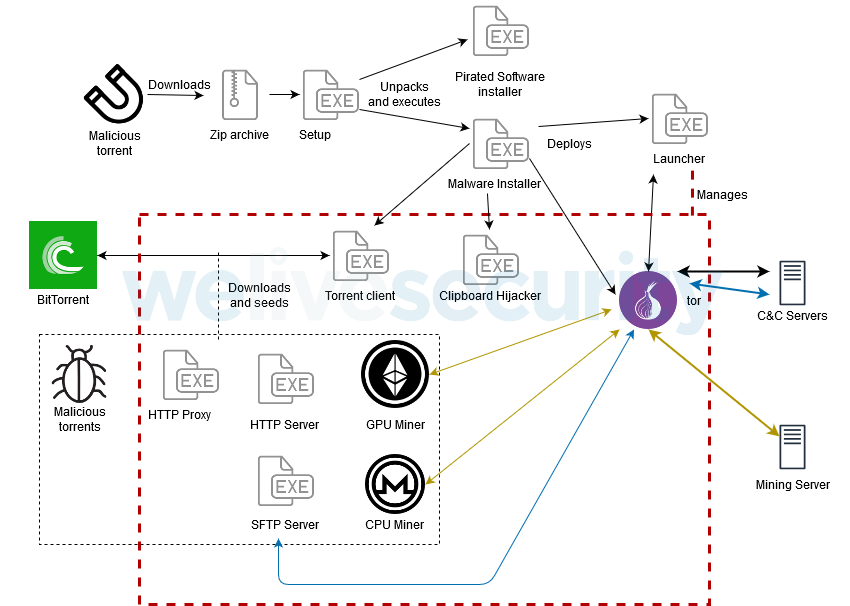 La compañía de seguridad informática, ESET, identificó un malware que se propaga a través de torrents y constituye una triple amenaza ya que utiliza los recursos de la víctima para minar monedas e intenta tomar el control de las transacciones.