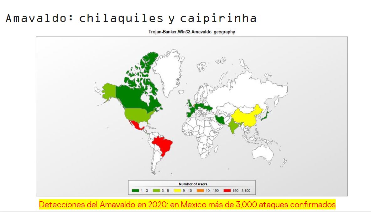 Al igual que con las otras campañas, Amavaldo comenzó a operar en Brasil en 2015 y, se expandió a México solo recientemente. “Es interesante ver cómo se desarrolló esta campaña. Por medio de nuestro sistema basado en la nube (Kaspersky Security Network), confirmamos más de 3.000 ataques a través de este troyano en México, haciéndolo más activo fuera de Brasil”, informa Assolini.