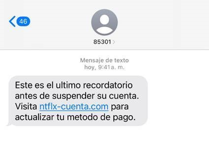 Los cibercriminales utilizan mensajes de SMS para engañar a las personas, alertándolas falsamente de que su cuenta de Netflix está a punto de ser suspendida. Envían estos mensajes a cualquier usuario, empleando enlaces fraudulentos desde números locales para aumentar su credibilidad y atraer a más víctimas. Confían en que las personas ingresarán sus datos para evitar la suspensión de su cuenta, incluso si no han tenido problemas con el servicio.