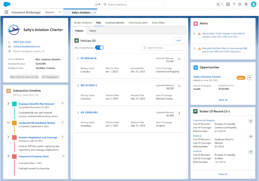 AI-Powered Client Engagement utiliza Data Cloud para crear un perfil de cliente completo que unifica todos los datos estructurados y no estructurados relevantes, incluidos los detalles de la póliza, el historial de reclamaciones y las interacciones del cliente en tiempo real, en una sola plataforma. Con este perfil de cliente unificado, los productores y gestores de cuentas pueden ahora utilizar la IA para ayudarles a identificar patrones y tendencias críticas, como lagunas en la cobertura o posibles riesgos de retención, o dónde centrar los esfuerzos, como priorizar prospectos.