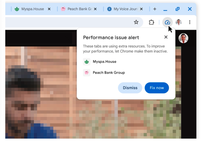 Mientras que algunos usuarios de Chrome prefieren aumentar manualmente el rendimiento cuando se sienten lentos, la herramienta de detección de rendimiento puede encargarse de todo con un solo clic. Google describe esta función como una forma de identificar proactivamente los problemas de rendimiento y ofrecer soluciones. Para utilizarla, basta con buscar una notificación de «Alerta de problema de rendimiento» y hacer clic en «Corregir ahora» para aplicar la corrección que Chrome considere oportuna.