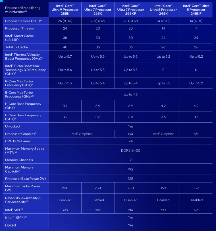 El procesador Intel Core Ultra 9 285K encabeza la gama de cinco procesadores desbloqueados. Estos procesadores cuentan con hasta 8 núcleos de rendimiento (núcleos P) de última generación y hasta 16 núcleos eficientes (núcleos E) de última generación, que ofrecen un rendimiento multihilo hasta un 14% superior en comparación con la generación anterior.