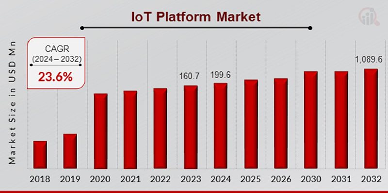 Un nuevo informe publicado por Market Research Future revela que el valor del mercado de plataformas IoT alcanzó los US$199,6 millones en 2024 y se proyecta que ascenderá a la impresionante cifra de US$1.089,6 millones para 2032. Este crecimiento exponencial se traduce en una tasa de crecimiento anual compuesto (CAGR) del 23,6% durante el período comprendido entre 2024 y 2032.