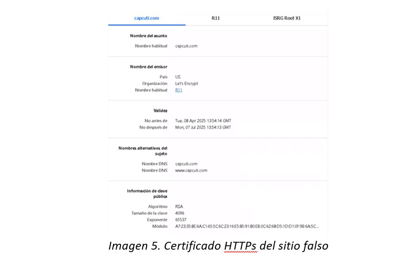 Al analizar el sitio falso, ESET identificó que el certificado utilizado por los cibercriminales para el protocolo HTTPS es válido desde el 08-04-2025 hasta el 07-07-2025. Esta información da una idea de la posible duración de la campaña maliciosa y representa, además, otro indicio para cuestionar la legitimidad del sitio.