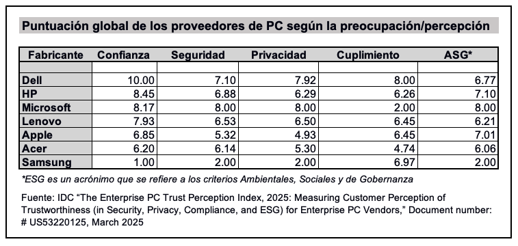 Entre los hallazgos del estudio, se destaca que Dell obtuvo la puntuación más alta en confianza entre sus clientes, lo que sugiere un rendimiento sólido en los cuatro pilares evaluados. Otros proveedores también fueron calificados, con Dell alcanzando un 10.00, seguido por HP con 8.45, Microsoft con 8.17, Lenovo con 7.93, Apple con 6.85, Acer con 6.20 y Samsung con 1.00.