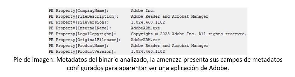“Al analizar lo metadatos, se observa que los mismos buscan aparentar ser de la aplicación Adobe pero no cuentan con una firma digital válida ni certificado asociado, lo cual confirma que no se trata de un binario legítimo emitido por la compañía.”, comenta Martina López, Investigadora de Seguridad informática de ESET Latinoamérica.
