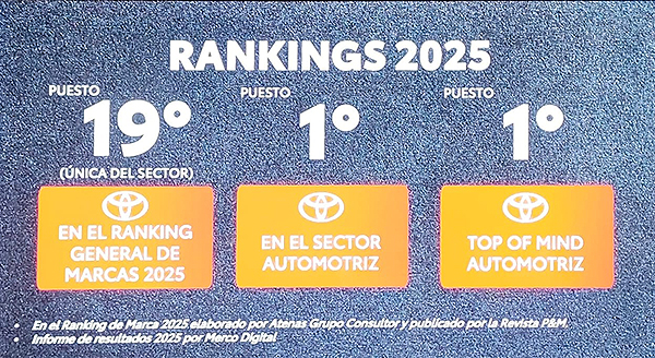 En el ranking de marcas que presentó la Revista P&M, conducido por el grupo Atenas Grupo, destaca que Toyota fue la única marca automotriz en aparecer en el ranking total. «Además, es la número uno en su ramo por segundo año consecutivo», dijo.