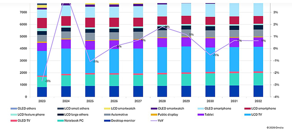Para 2026, se espera que la demanda de DDIC para televisores LCD repunte un 4% interanual, apoyada por el crecimiento en los envíos de paneles 4K+. No obstante, se proyecta que la demanda global total de DDIC se mantenga plana, ya que los descensos en las aplicaciones de informática compensarán la recuperación en el sector de televisión. La escasez de memoria y los aumentos de precios relacionados limitarán el crecimiento de AMOLED al 0% interanual y frenarán la transición de teléfonos LTPS LCD a AMOLED, lo que resultará en una caída del 2% interanual en los envíos totales de DDIC para teléfonos inteligentes. A partir de 2027, se espera que el crecimiento de DDIC para teléfonos AMOLED sea de aproximadamente el 3% anual.