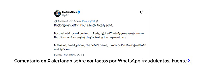Comentario en X alertando sobre contactos por WhatsApp fraudulentos. Fuente X
