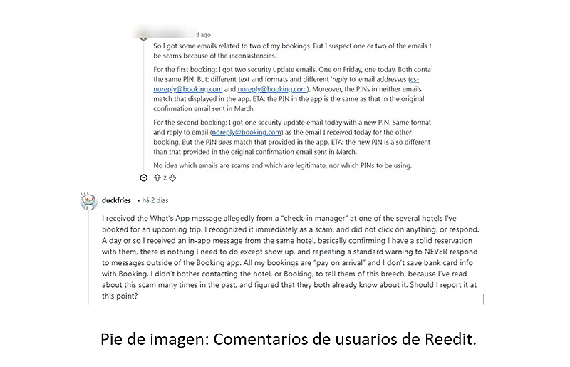 Varios usuarios recurrieron a foros como Reddit para documentar la recepción de mensajes sospechosos enviados por correo electrónico y WhatsApp. Los testimonios indican que los estafadores tuvieron acceso a información privada, como nombres completos y detalles específicos de las estadías, y utilizaron esos datos para dar credibilidad a solicitudes urgentes de pago.