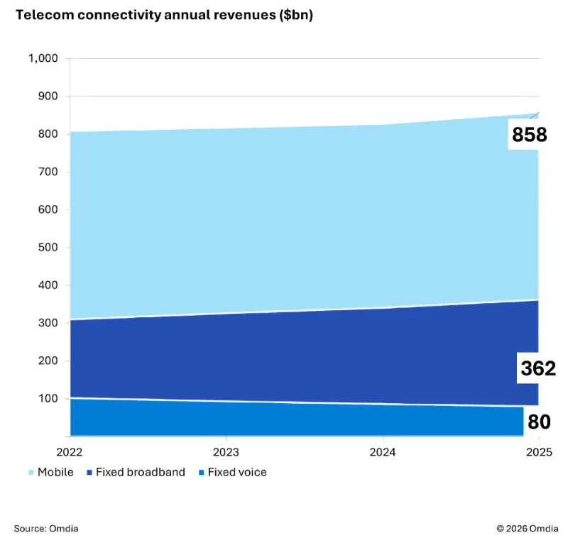 La última actualización de mercado de Omdia revela que el mercado global de conectividad, que abarca telefonía móvil, banda ancha fija y voz fija, alcanzó los US$ 333 mil millones en el cuarto trimestre de 2025, lo que representa un crecimiento interanual del 5%. Los ingresos totales del año sumaron US$ 1.3 billones en 2025, un aumento del 4% interanual. Los resultados resaltan los desafíos constantes para la industria de las telecomunicaciones, que sigue dependiendo de un negocio principal de crecimiento lento mientras trabaja para establecer nuevas fuentes de ingresos.