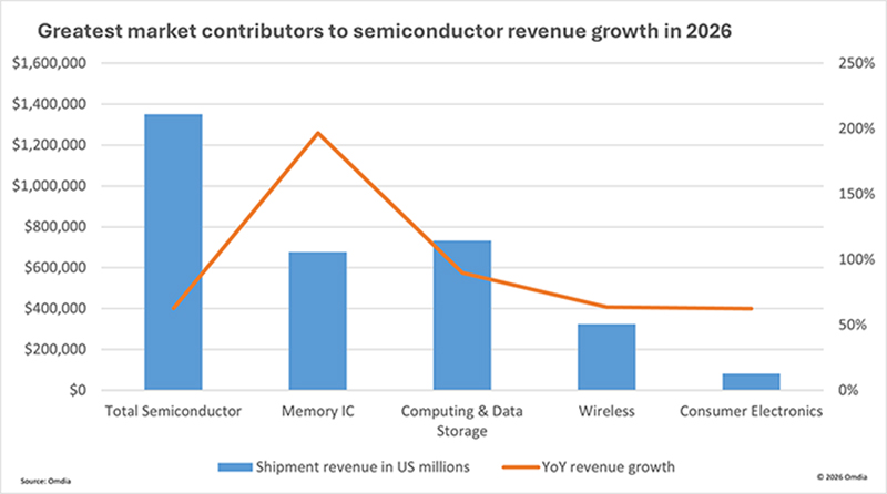 La informática y el almacenamiento de datos liderarán todos los segmentos en el crecimiento de los ingresos por semiconductores, aumentando un 90% interanual en 2026 para superar los US$ 700.000 millones. Esto se debe a la fuerte demanda de servidores para centros de datos y otras aplicaciones intensivas en memoria, junto con los elevados precios de los circuitos integrados de memoria.